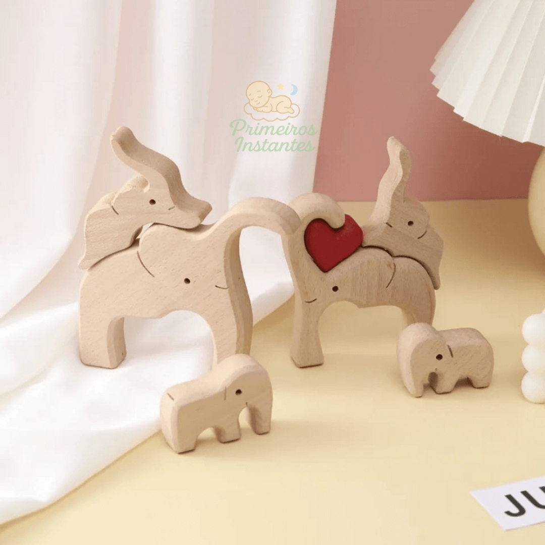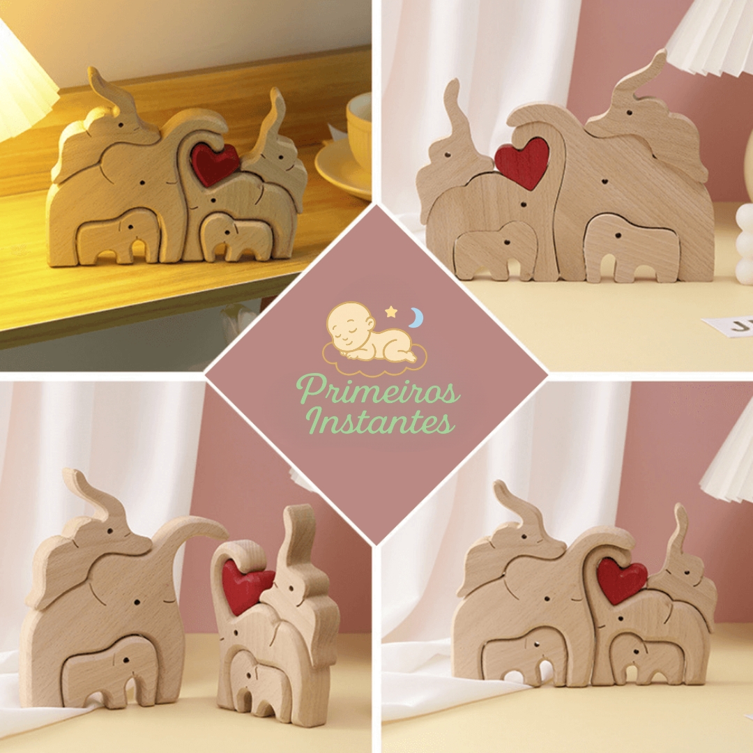 Cada escultura é feita à mão em madeira de alta qualidade, representando uma família de Elefantes, refletindo sua própria família. O coração vermelho no centro simboliza o amor incondicional, enquanto o espaço para gravação dos nomes transforma cada peça em algo verdadeiramente seu